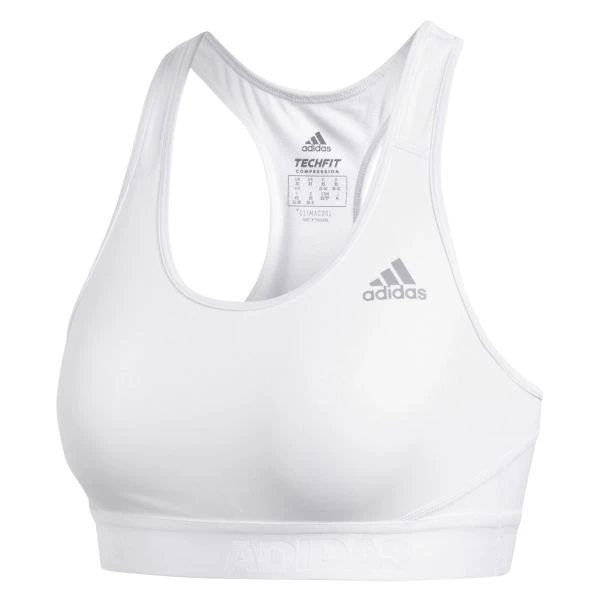 This sports bra helps keep everything in place so you can focus on your workout. The stretchy knit bra has a compression fit that offers medium support. The mesh panel in back keeps air circulating to cool you down. Medium support offers a close fit with compression and a pullover design. Scoop neck & racer back design. 83% recycled polyester / 17% elastane double knit. adidas have created Alphaskin for a locked-in feel.