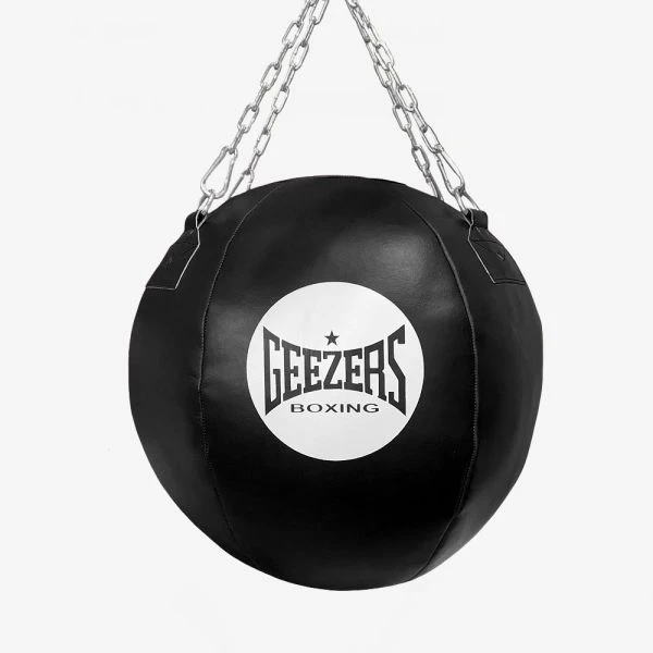 Geezers Elite Pro Leather Super Heavy Wrecking Ball – Made using the finest quality leather the punch bag has a full impact foam liner and is perfectly weighted using the best filling materials. The foam lining is designed to protect the boxer’s hands when punching, plus offering the ultimate feel on impact. Featuring precision stud and stitch work, this bag should not sag or misshape. The bag is complete with red detailing on the top of the bag. The wrecking ball’s unique shape allows the boxer to throw every shot in his arsenal – hooks, uppercuts, straights and many more. Hanging chains included.