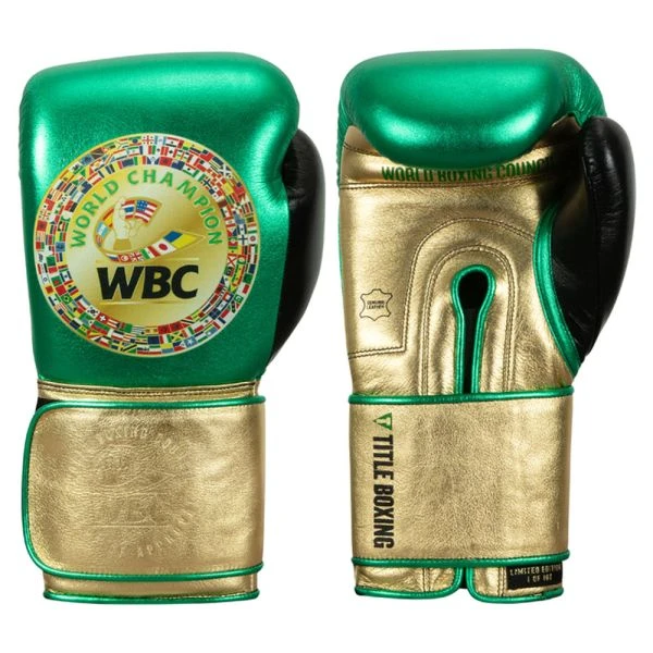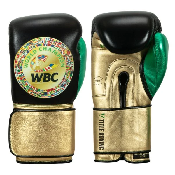 TITLE Boxing ABC Green Belt Training Gloves – In the TITLE WBC Green Belt Training Gloves, you can train with the ultimate championship in mind. Honor one of the biggest organizations in boxing with a pair of handmade gloves constructed from 100% genuine cowhide leather in bold green, gold and black patterns. These boxing training gloves are designed with a secure closure to prevent slipping and a moisture wicking interior lining to get you back in the ring faster. The inset embossed TITLE and WBC labels help prevent nicks and cuts while in the ring. Officially licensed and approved by the World Boxing Council.